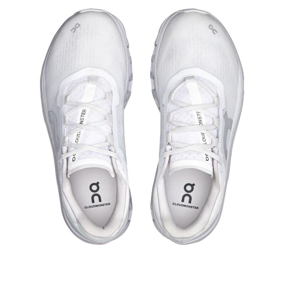 Experience ultimate comfort and style with the On Cloudmonster in White/Glacier. Its innovative CloudTec technology delivers a cushioned, responsive ride for